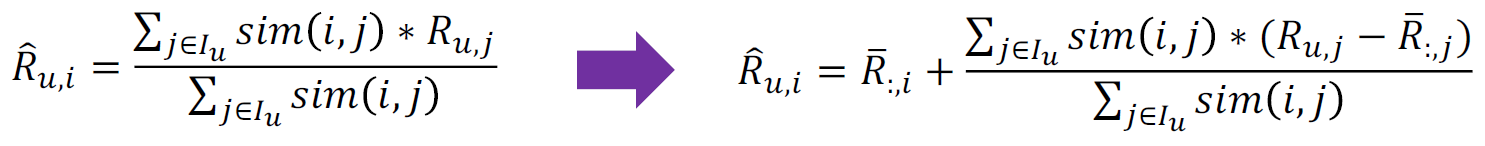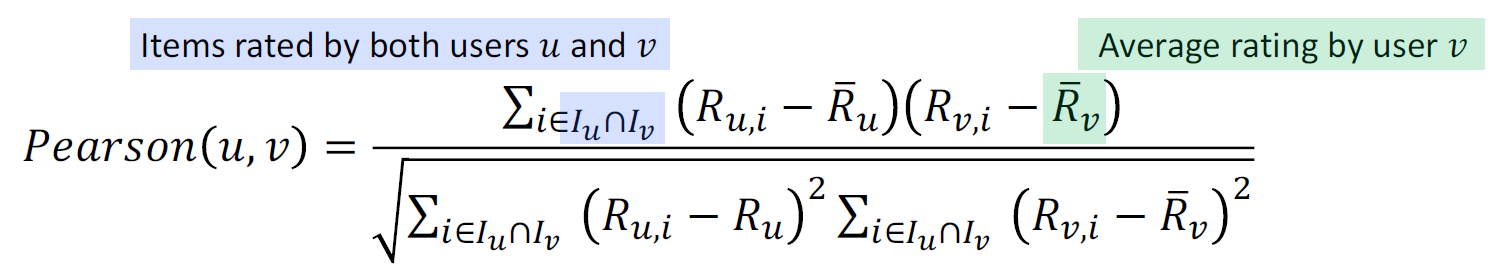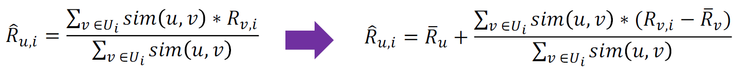 -> Subtract the average(평균에서 얼마나 차이나는지를 확인함, 사용자 v와 u의 공통된 item이 많이 필요)